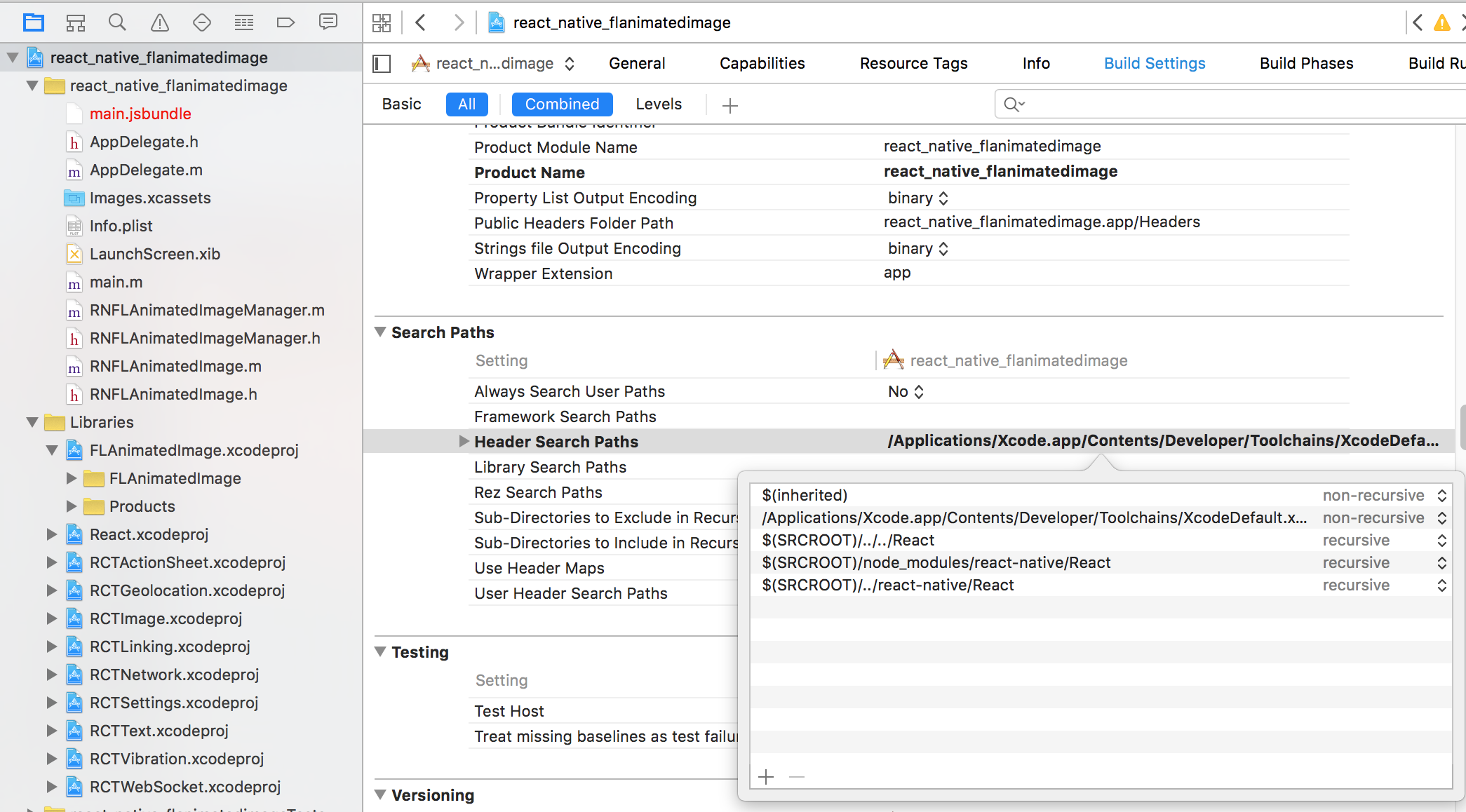 The first thing we are going to need to do is setup our Header Search Paths and add React to it.