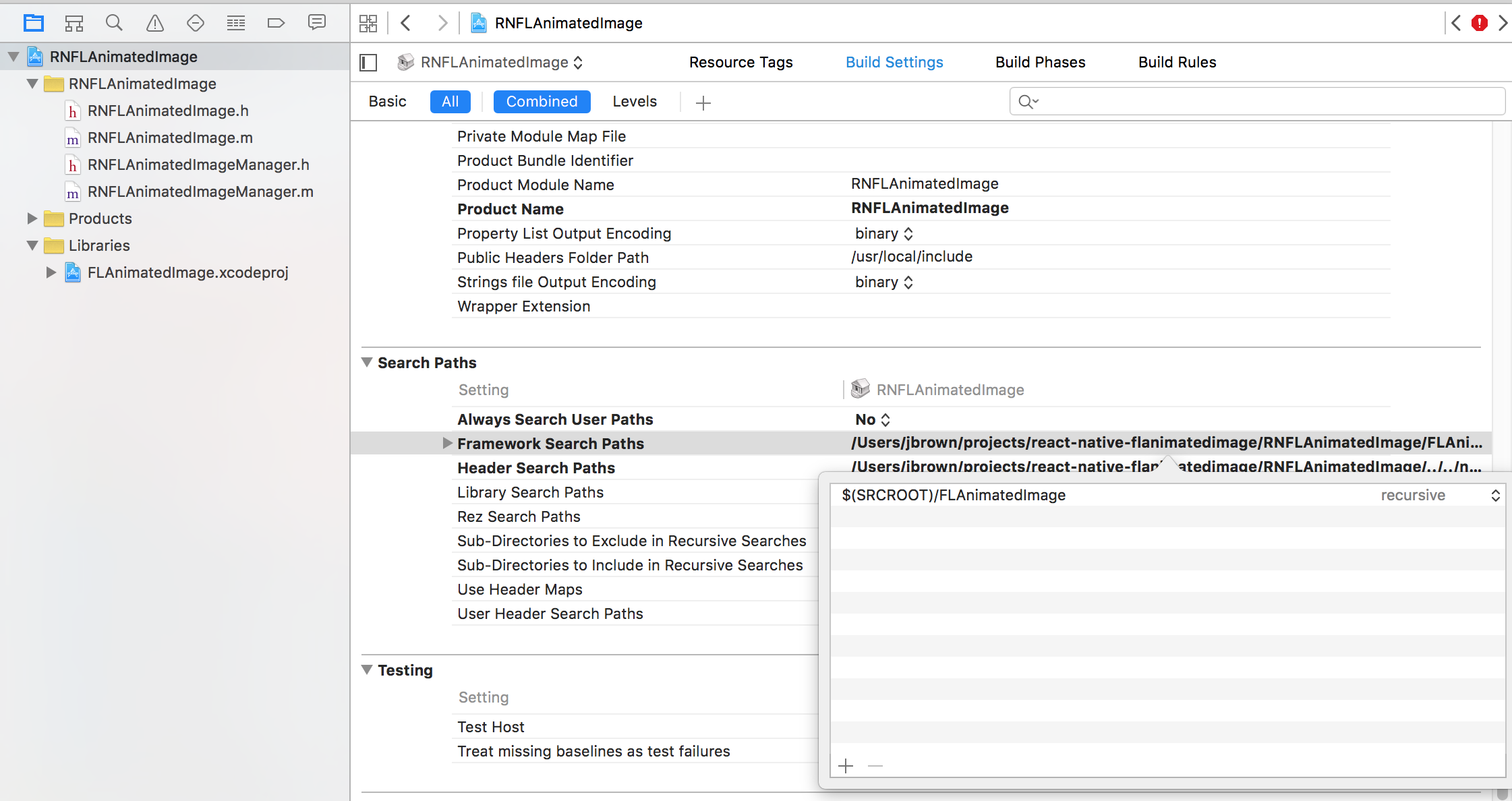 So lets set that up, add $(SRCROOT)/FLAnimatedImage the Framework Search Paths right above Header Search Paths