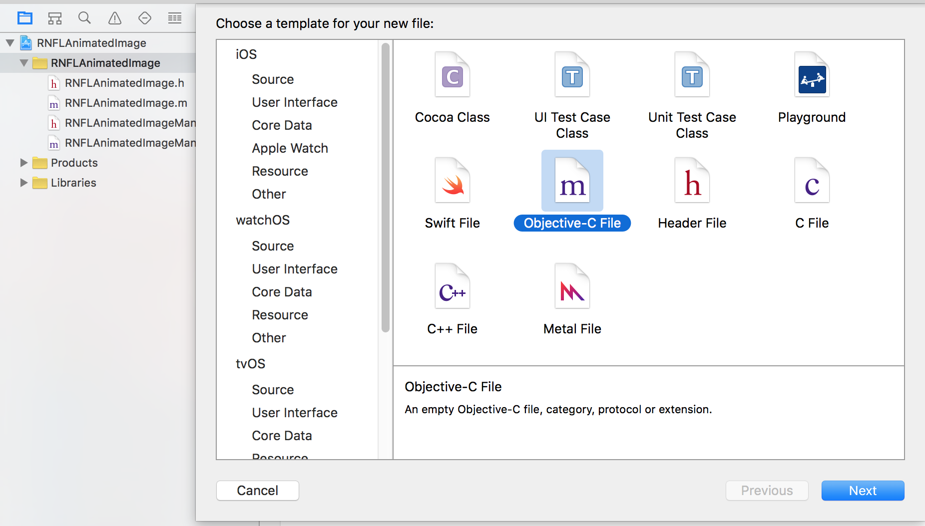 Just right click on the folder select "New File" and create a .m and name in RNFLAnimatedImageManager.m , same for the .h