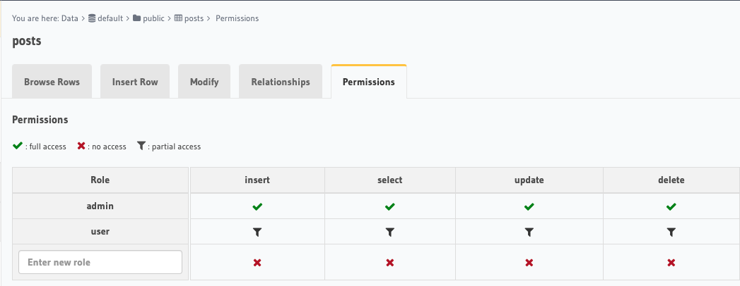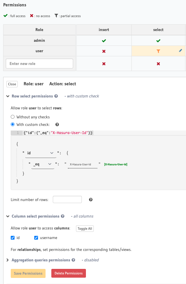 Let's take a look at the permissions we have setup. There are 2 roles admin and user. The admin role can do anything it wants, this will be what your backend systems operate as. Then there is the user role. This role is locked down to be able to load themselves as a user. Then additionally for posts we setup insert, select, update, and delete anything related where the user_id matches the x-hasura-user-id in their token.