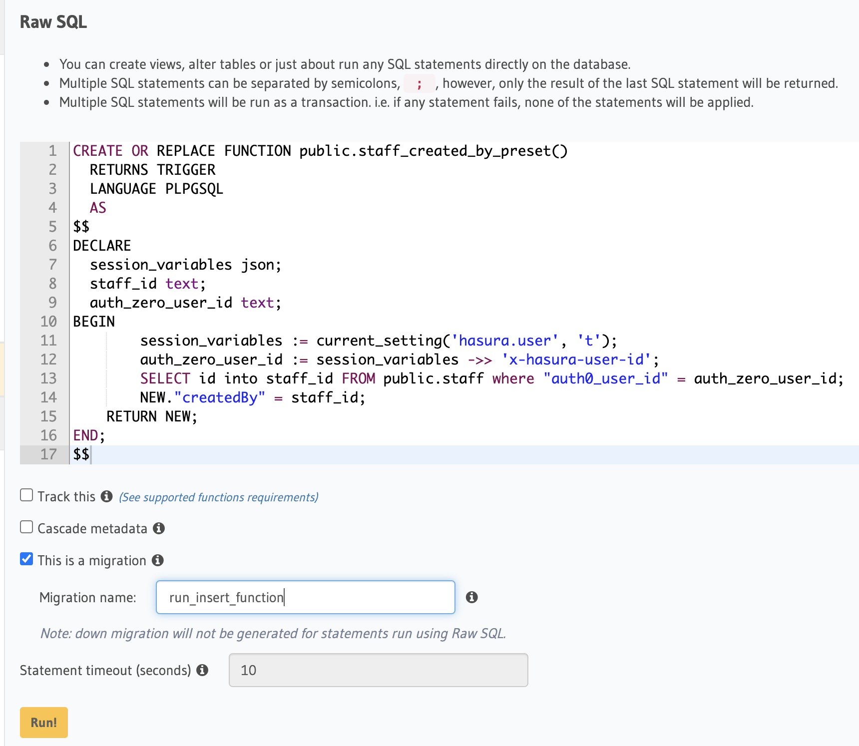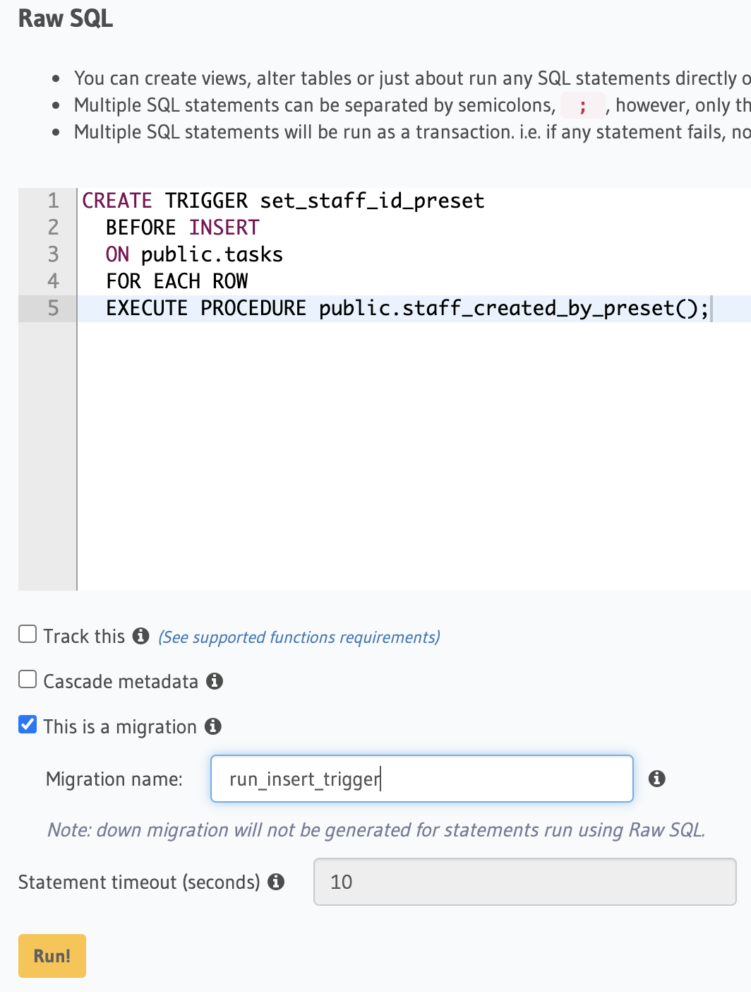 Now all that is left to do is run in the Data > SQL tab and save it as a migration.
